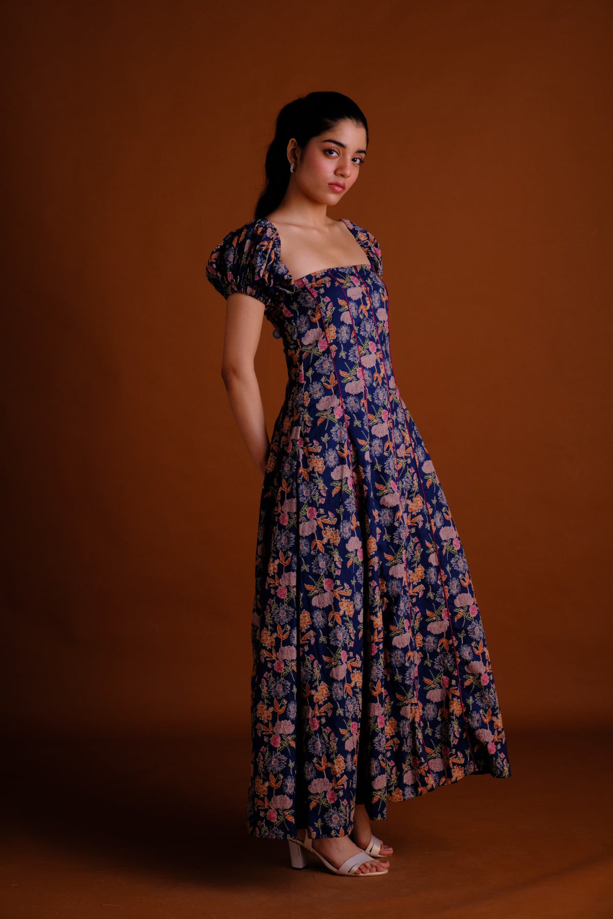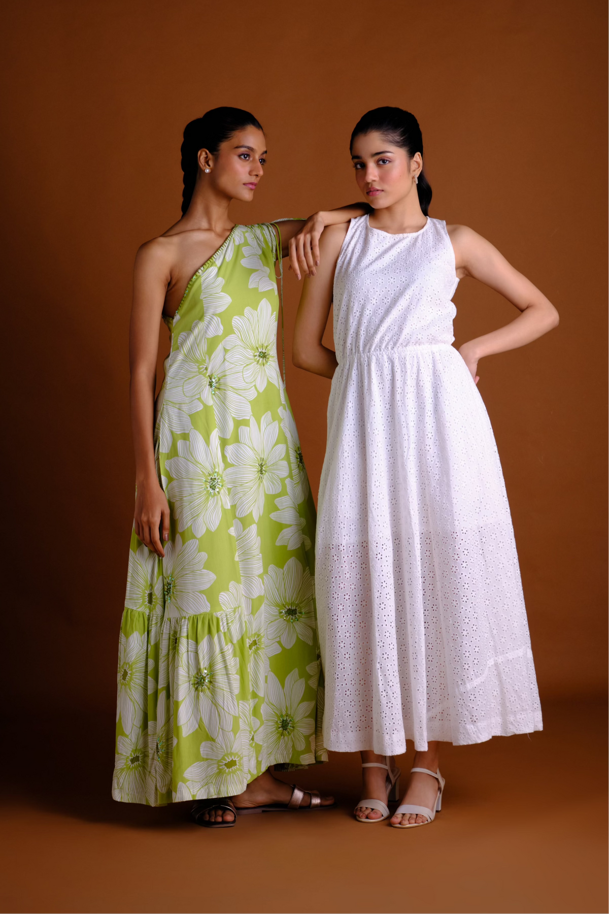 Zinnia Dress - Green Floral Printed Ruffled Straps Long Flared Dress