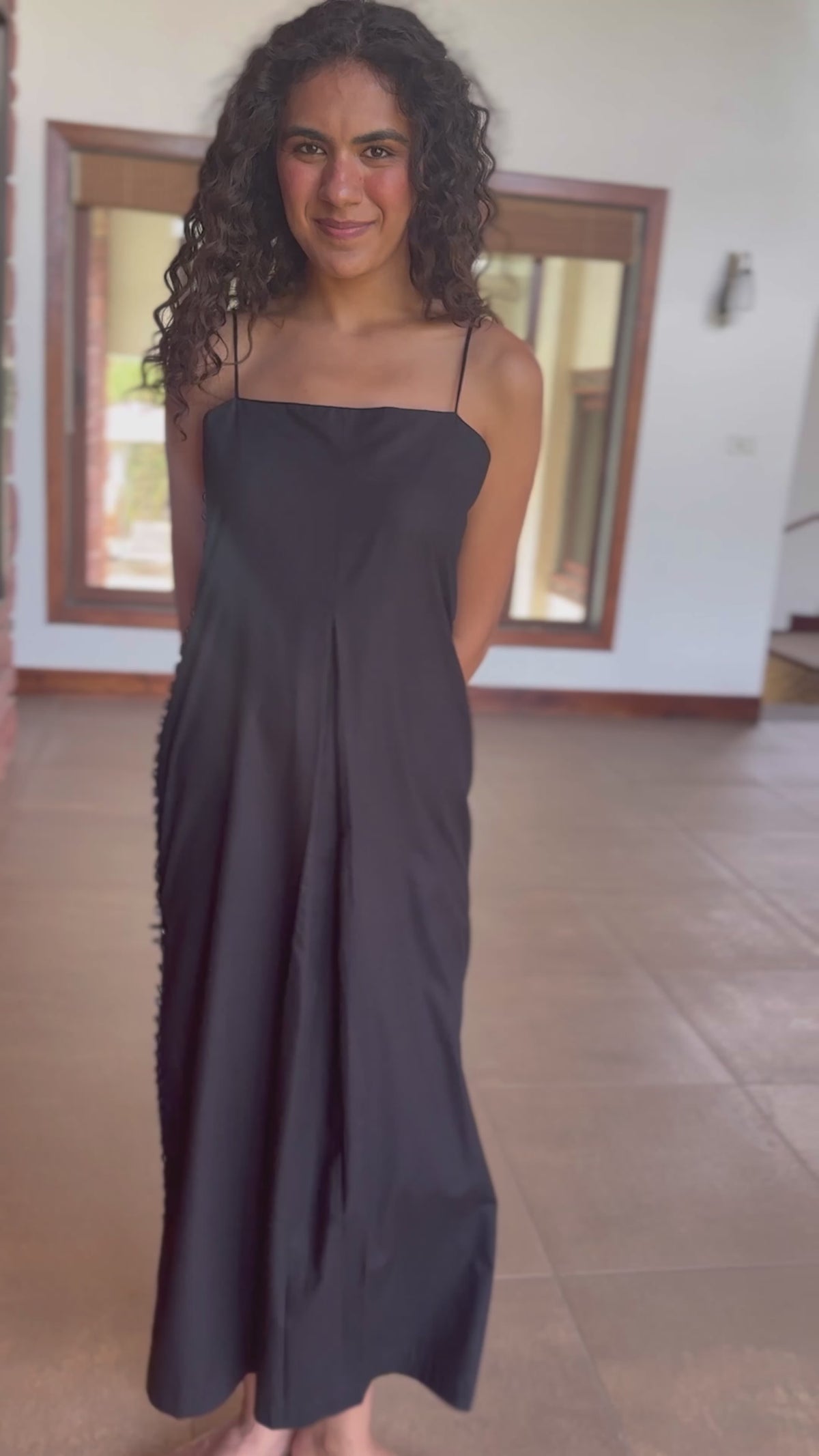 The Lana Long Dress is made from a high quality glazed cotton fabric. It is a long length dress that features button down opening on the side, brad front pleat and thin staps.