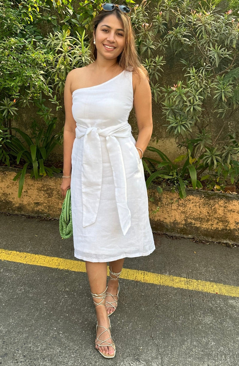 Naomi Dress - White Jute Linen One Shouldered Knee Length Dress